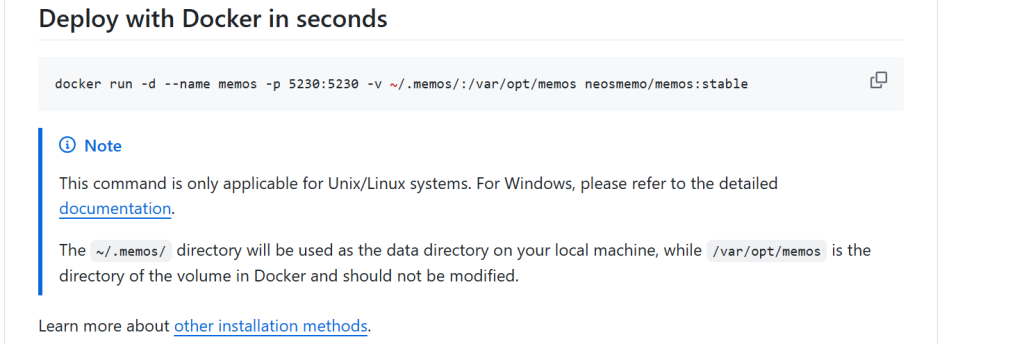 docker run -d --name memos -p 5230:5230 -v ~/.memos/:/var/opt/memos neosmemo/memos:stable