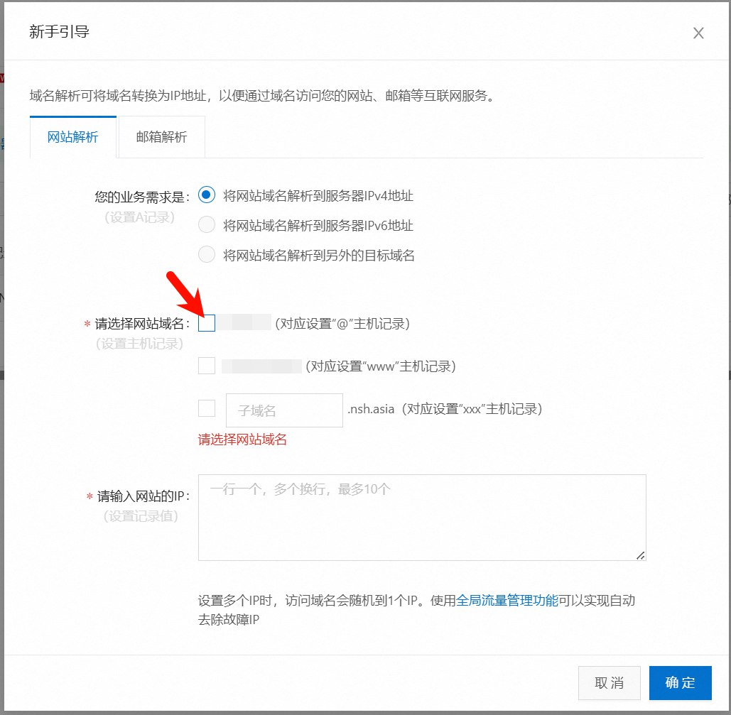 如果我们购买了一个域名,以阿里云域名为例,进入阿里云域名控制台,我们可以配置 DNS 解析,使自己的域名能被解析到我们的公网 IP 上